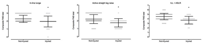 Rugby union is a collision sport with a relatively high risk of injury. The ability of the Functional Movement Screen (FMS) or its component tests to predict the occurrence of severe (≥28 days) injuries in professional players was assessed. Ninety FMS test observations from 62 players across 4 different time periods were compared with severe injuries sustained during 6 months after FMS testing. Mean composite FMS scores were significantly lower in players who sustained severe injury (injured 13.2 ± 1.5 vs. noninjured 14.5 ± 1.4, Effect Size = 0.83, large) because of differences in in-line lunge (ILL) and active straight leg raise scores (ASLR). Receiver-operated characteristic curves and 2 × 2 contingency tables were used to determine that ASLR (cut-off 2/3) was the injury predictor with the greatest sensitivity (0.96, 95% confidence interval [CI] = 0.79-1.0). Adding the ILL in combination with ASLR (ILL + ASLR) improved the specificity of the injury prediction model (ASLR specificity = 0.29, 95% CI = 0.18-0.43 vs. ASLR + ILL specificity = 0.53, 95% CI = 0.39-0.66, p ≤ 0.05). Further analysis was performed to determine whether FMS tests could predict contact and noncontact injuries. The FMS composite score and various combinations of component tests (deep squat [DS] + ILL, ILL + ASLR, and DS + ILL + ASLR) were all significant predictors of contact injury. The FMS composite score also predicted noncontact injury, but no component test or combination thereof produced a similar result. These findings indicate that low scores on various FMS component tests are risk factors for injury in professional rugby players.