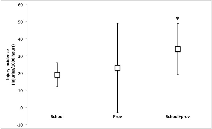Despite its apparent popularity, participation in the sport of rugby union is accompanied by a significant risk of injury. Concerned parties have recently questioned whether this risk is acceptable within school populations. This is difficult to assess within the South African schools’ population as no recent longitudinal injury studies exist. Training and match exposure in both school and provincial competition were examined and the resultant injuries were longitudinally observed for the duration of a South African high school rugby season. Match (79, 95% CI 52-105 injuries/1 000 h) and training (7, 95% CI 3-11 injuries/1000h) injury incidences were demonstrated to be greater than previously reported incidences in similar populations in England and Ireland. Weeks where players were exposed to both school and provincial competition (34, 95% CI 19-49 injuries/1 000 h) had significantly (p< 0.05) greater injury incidences than during school competition alone (19, 95% CI 12-26 injuries/1 000 h). The injury risk demonstrated was greater than expected and represents reasons for concern. Possible reasons for the high injury incidence recorded may be the frequency of games played within the season, and the overlap of school and provincial competitions.