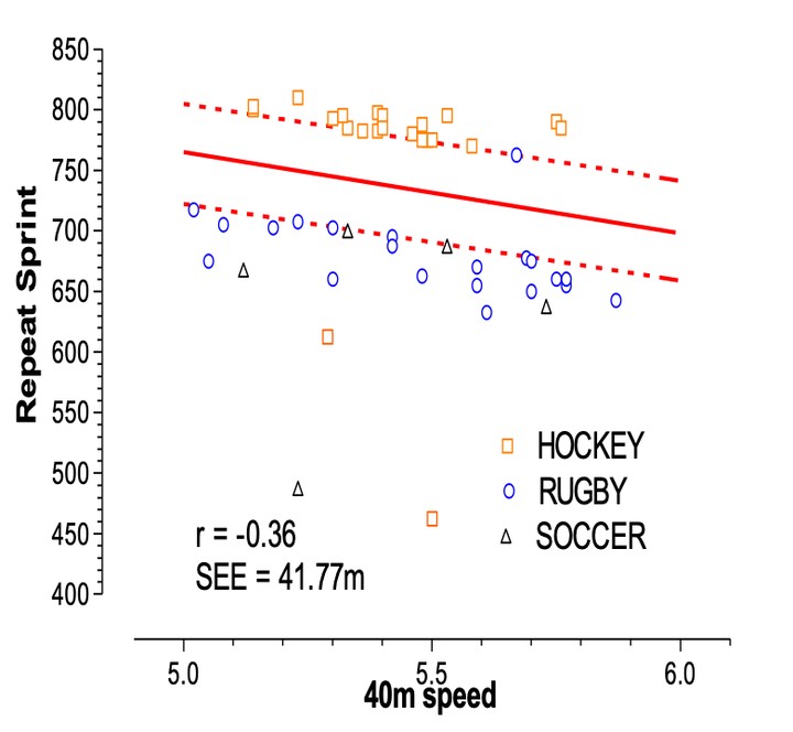 The 5-m repeat-sprint test (5-m RST) measures resistance to fatigue after repeated bouts of short-duration, high-intensity activity. This study determined the components of fitness associated with performance in 5-m RSTs. Speed (10-m and 40-m sprints), strength (bench press), agility, strength endurance (pull-ups and push-ups), and aerobic power (20-m shuttle-run test) were measured in male provincial- or national-level rugby (n = 110), hockey (n = 59), and soccer (n = 55) players. Subjects with either high (HI) or low (LO) resistance to fatigue in the 5-m RST differed in body mass (76.9 ± 11.6 kg vs 102.1 ± 18.9 kg, HI vs LO, respectively, P < .001), agility (14.55 ± 0.41 seconds vs 15.56 ± 0.30 seconds, P < .001), bench press (86 ± 20 kg vs 114 ± 33 kg, P = .03), pull-ups (13 ± 4 vs 8 ± 5, P = .02), push-ups (56 ± 12 vs 39 ± 13, P = .002), and 20-m shuttle-run test (20-m SRT; 133 ± 11 vs 87 ± 12 shuttles, P < .001). Body mass, strength, and aerobic power were the best predictors of 5-m RST performance: 5-m RST = -1.274(mass) + 0.756(1RM bench press) + 2.053(number of 20-m SRT shuttles) + 549.409 (R2 = .66). Performance in the 5-m RST is predicted best by a combination of factors including body mass, strength, and aerobic ability, rather than by any single component of fitness.
