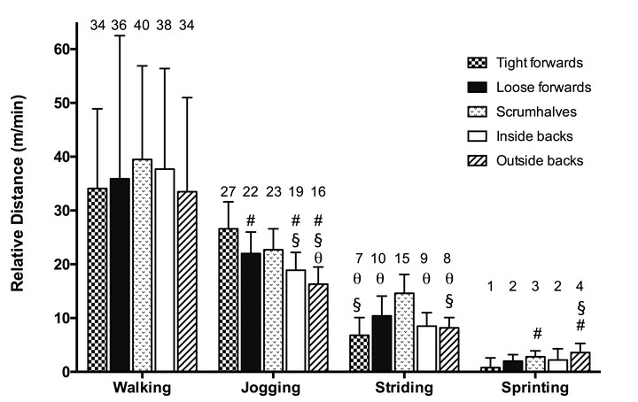 Global positioning system (GPS) technology can provide accurate, non-invasive, real-time movement analysis of players participating in team sports. The application of this technology to rugby union will improve training practices by allowing improved understanding of movement characteristics and more individualised programmes. Nineteen professional rugby players were tracked using GPS systems during 24 matches during the 2013 rugby season. Players were grouped as (i) backs or forwards and (ii) tight forwards, loose forwards, scrumhalves, inside backs or outside backs. Movements were categorised in speed zones corresponding to walking (0 - 2 m.s-1), jogging (2 - 4 m.s-1), striding (4 - 6 m.s-1) and sprinting (>6 m.s-1). Walking and jogging were classified as low-intensity and striding and sprinting as high-intensity movement zones. An inbuilt triaxial accelerometer (sampling frequency 100 Hz) measured the total impacts >5G and high-intensity impacts >8G. All data were normalised to time on field and reported as mean (standard deviation). There was no difference between forwards and backs in relative distance covered. Backs reached higher maximum speeds than forwards (backs 8.8 (1.1) v. forwards 7.6 (1.3) m.s-1, effect size (ES) 1.0, and outside backs were the fastest positional group (9.4 (0.9) m.s-1, ES 0.4 - 2.2). Players in all positions spent the majority of time walking (79 - 84%). Backs covered more distance than forwards in high-intensity speed zones (forwards 11 (5) v. backs 14 (4) m.min-1, ES 0.7). Tight forwards covered the most distance in low-intensity zones (63 (6) m.min-1, ES 0.3 - 1.7) while scrumhalves ran the most distance in high-intensity zones (20 (5) m.min-1, ES 1.2 - 3.6). High-intensity to low-intensity running ratios ranged from 1 to 13 (tight forwards) to 1:3 (scrumhalves). Loose forwards and inside backs exhibited similar movement patterns. There was no difference in impact variables between forwards and backs. Inside backs sustained the least total impacts (6.5 (1.2) >5G.min-1, ES 0.9 - 2.0) and high-intensity impacts (0.7 (0.2) >8G.min-1, ES 0.5 - 1.4). There were notable differences in the movement of professional rugby union players in different positions, and effective training programmes should reflect these variations.